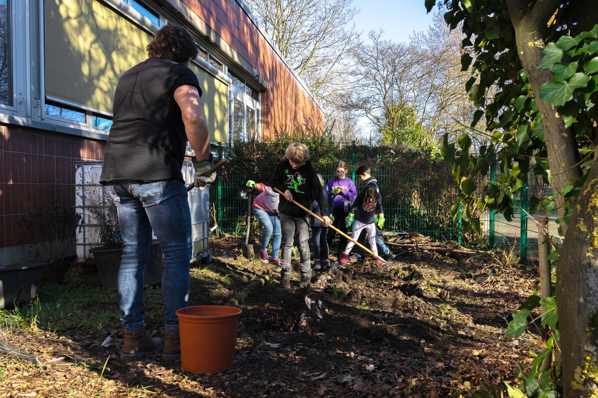 Teamarbeit: In der Schulgarten AG arbeiten die Schülerinnen und Schüler oft im Team, was den Zusammenhalt fördert und die Freude an der gemeinsamen Arbeit im Freien steigert.