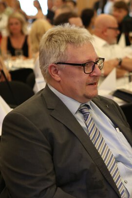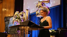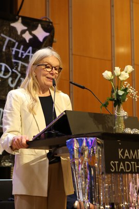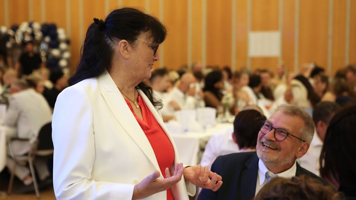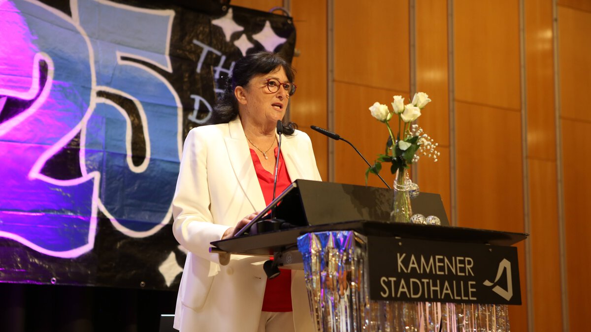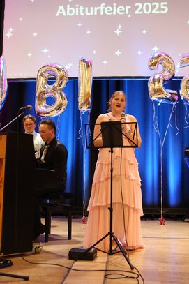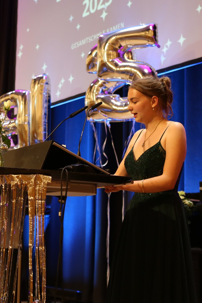 Beke B. als Schülersprecherin und Stufensprecherin richtete in ihrer Rede den Blick sowohl zurück auf die letzten drei Jahre in der gymnasialen Oberstufe als auch auf die Zukunft und betonte, dass es wichtig sei, angesichts der zahlreichen Herausforderungen durch Kriege, Klimawandel und die Bedrohung unserer Demokratie mutig, zuversichtlich und aktiv zu sein.