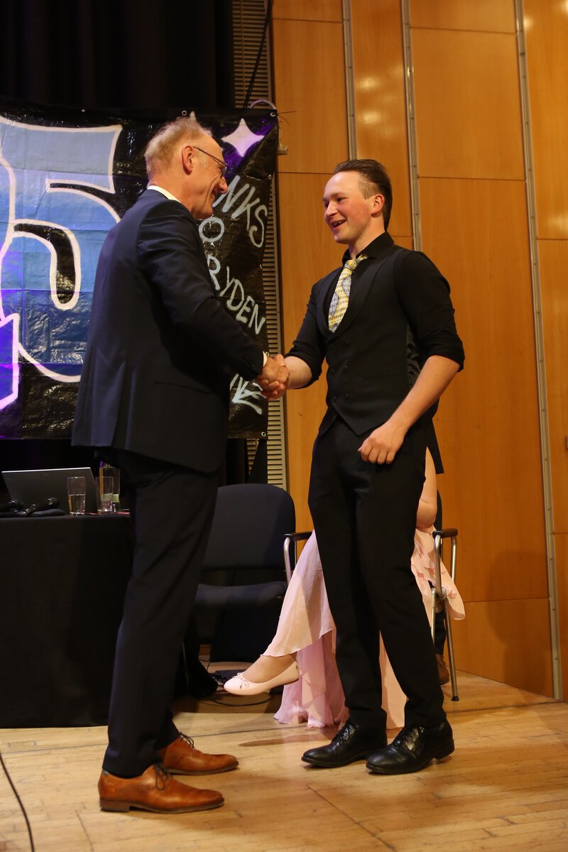 Und endlich war es soweit: Zum letzten Mal nahm Herr Tillmann in seiner Funktion als Abteilungsleiter die Abiturient*innen in Empfang – nach über 20 Jahren als Abteilungsleiter der gymnasialen Oberstufe wird er Mitte des kommenden Schuljahres in den verdienten Ruhestand gehen. Unter großem Applaus der mehr als 500 Gäste überreichten die Leistungskurslehrer*innen die Zeugnisse und dann hieß es: Buffet und Party, denn: A little party never killed our Abi!