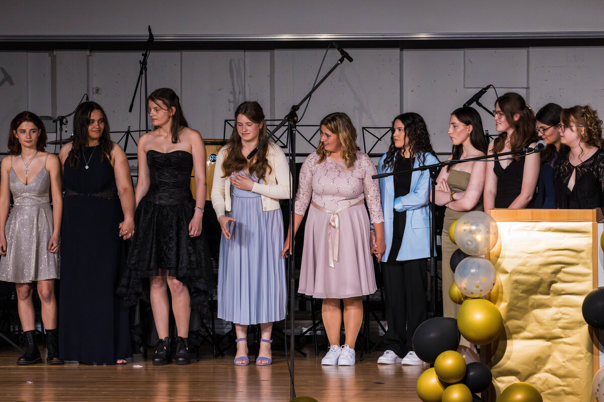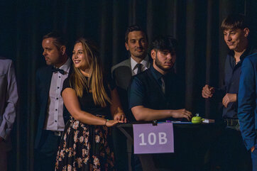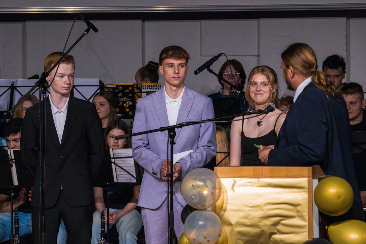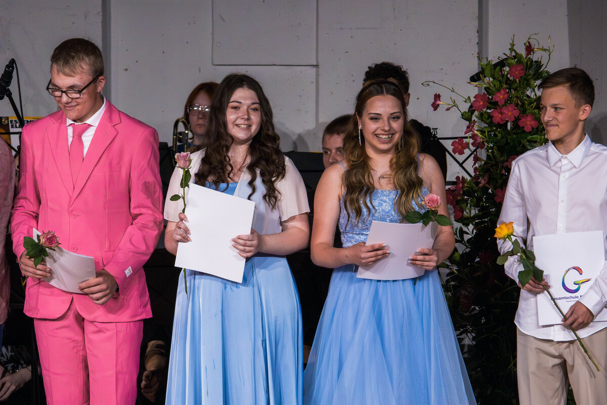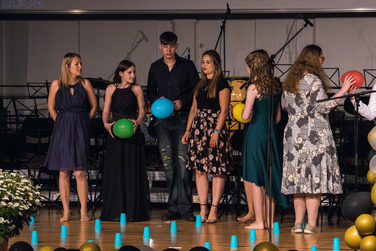 Besondere Auszeichnungen erhielten die jeweils besten Abschlüsse aus den drei schulischen Laufbahnen, bevor die Klassenlehrer*innen der Abschlussklassen gemeinsam mit je zwei Absolvent*innen zu einem amüsanten Bühnenquiz zu den Themen „Musik der 90er Jahre“, „Lehrendenfotos“ und „Kinderspiele“ aufgefordert wurden. Der unterhaltsame Auftritt des DaGe-Kurses wurde sehr lange und mit sehr viel Engagement unter der tatkräftigen Leitung von Frau Adler und Frau Hebbinghaus vorbereitet.