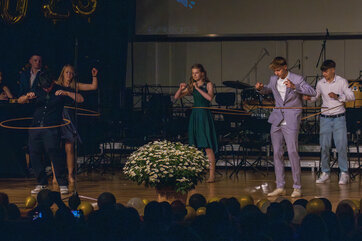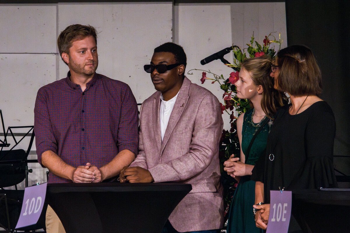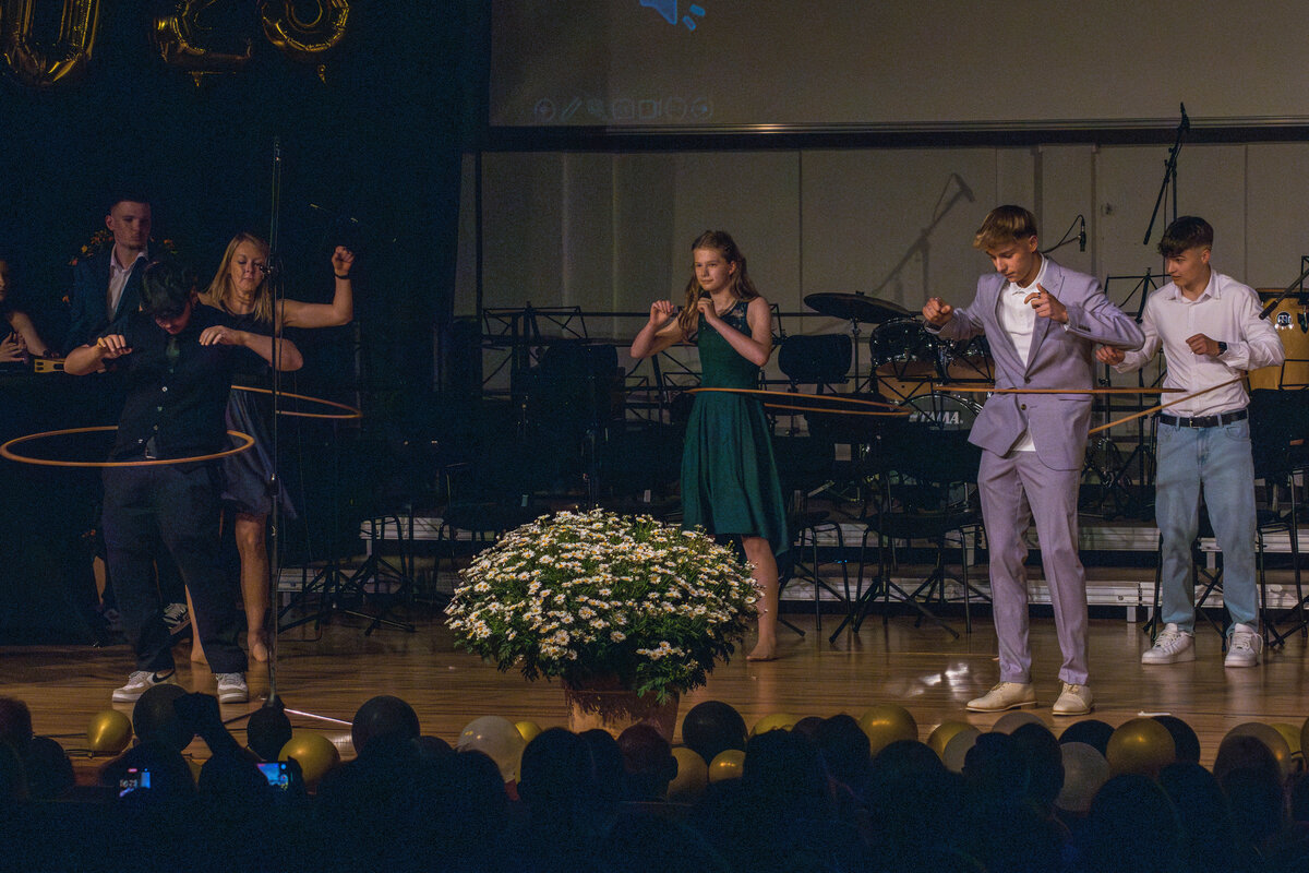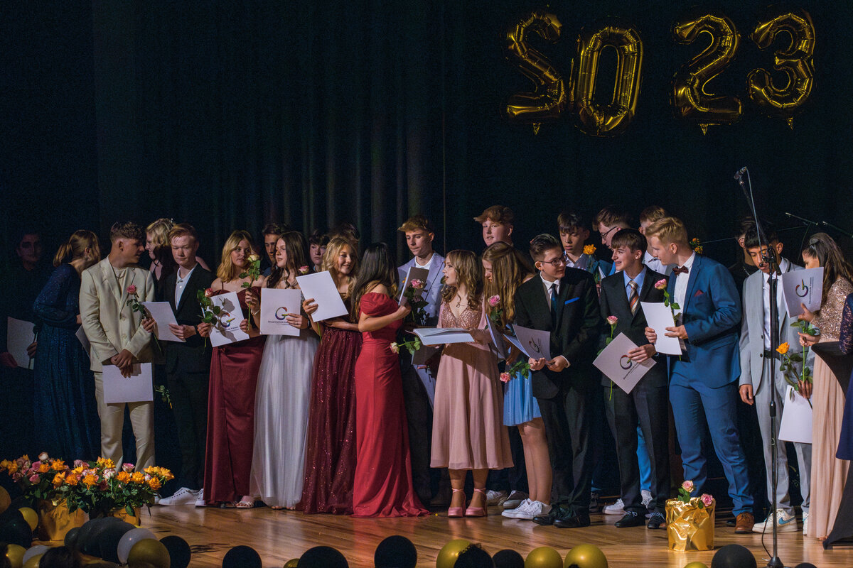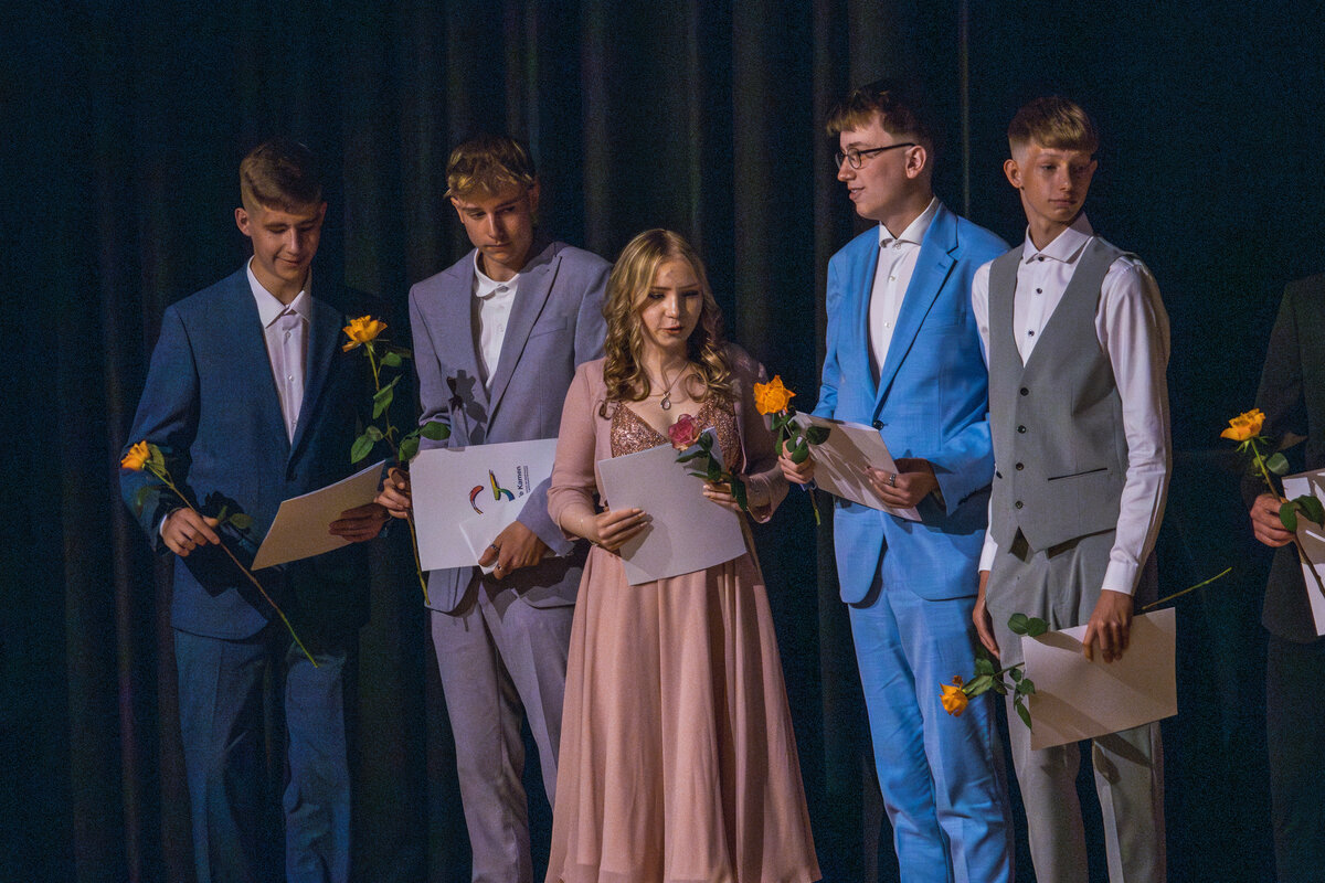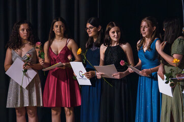 Besondere Auszeichnungen erhielten die jeweils besten Abschlüsse aus den drei schulischen Laufbahnen, bevor die Klassenlehrer*innen der Abschlussklassen gemeinsam mit je zwei Absolvent*innen zu einem amüsanten Bühnenquiz zu den Themen „Musik der 90er Jahre“, „Lehrendenfotos“ und „Kinderspiele“ aufgefordert wurden. Der unterhaltsame Auftritt des DaGe-Kurses wurde sehr lange und mit sehr viel Engagement unter der tatkräftigen Leitung von Frau Adler und Frau Hebbinghaus vorbereitet.