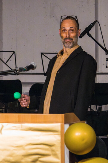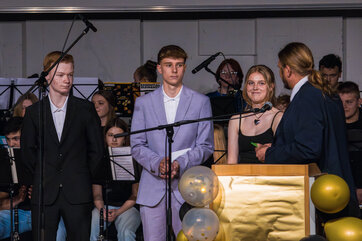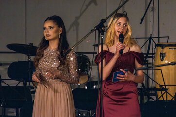 Die Moderatoren Michel Henter und Fidel Badran aus dem Abschlussjahrgang führten durch das abwechslungsreiche Programm aus Reden, Musik und Abendunterhaltung.