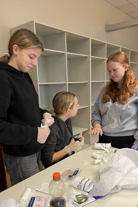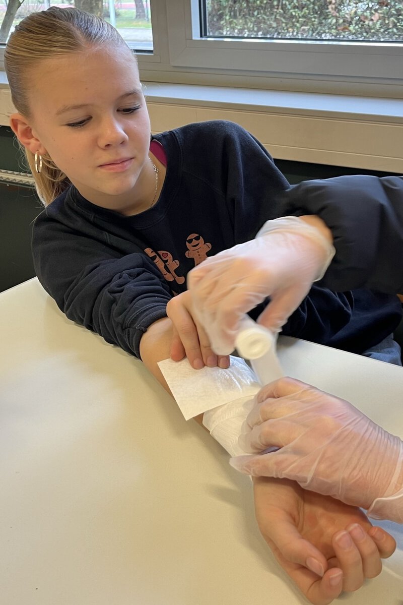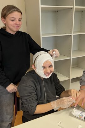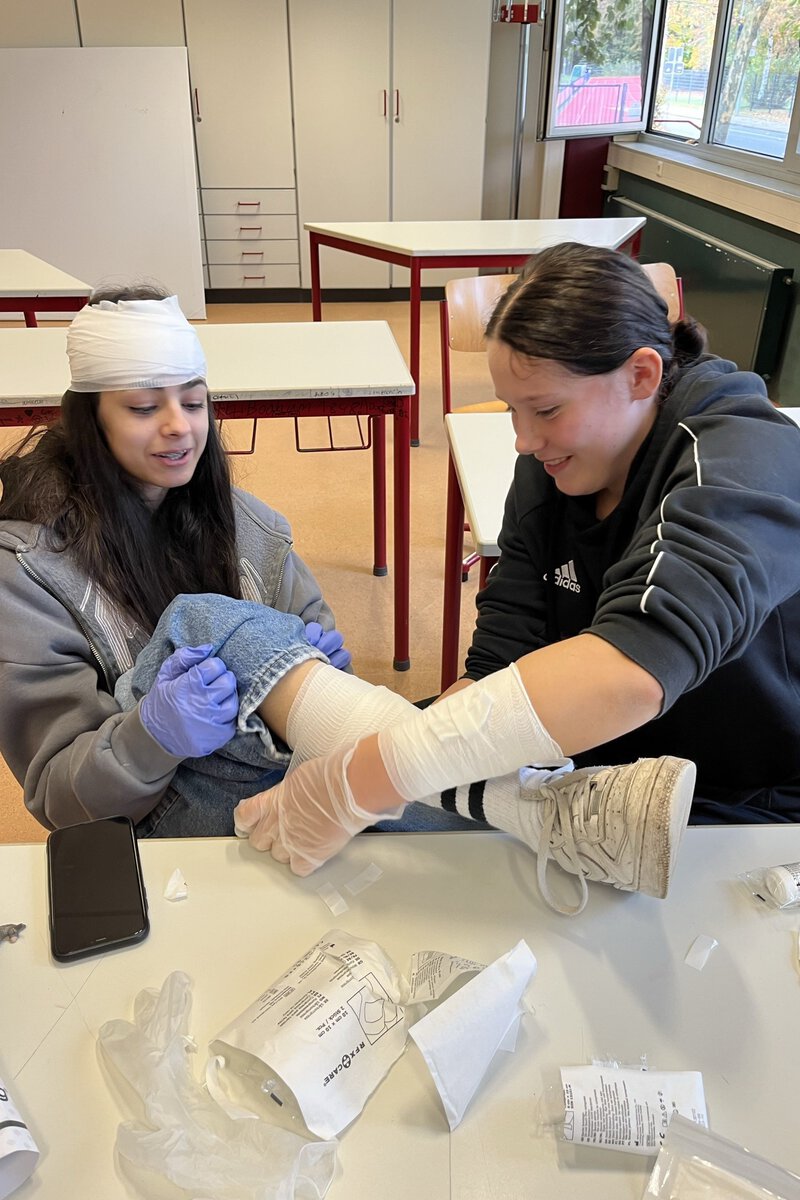 Das fachgerechte Versorgen von Verletzungen und das Anlegen von Verbänden machte nicht nur viel Spaß, sondern ermöglichte unseren neuen Schulsanitäter*innen und Schulsporthelfer*innen, ihre neuen Aufgaben so kompetent wie möglich anzugehen.