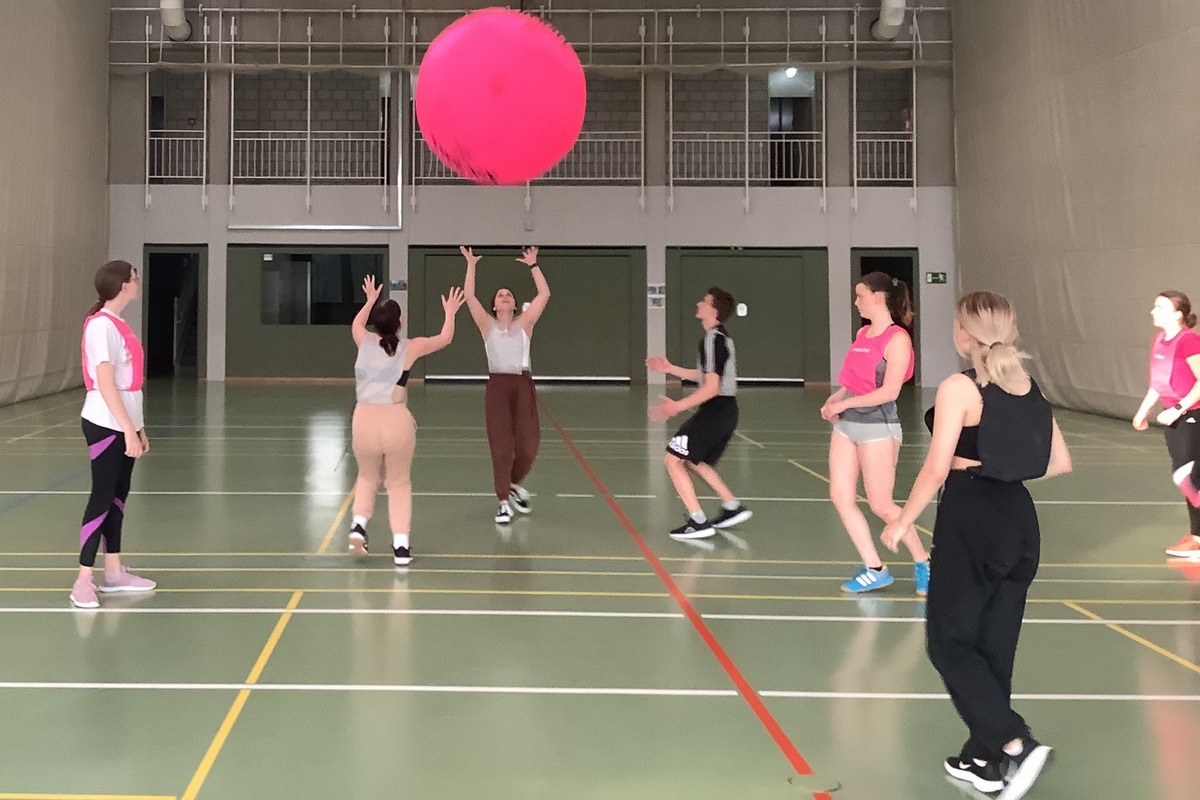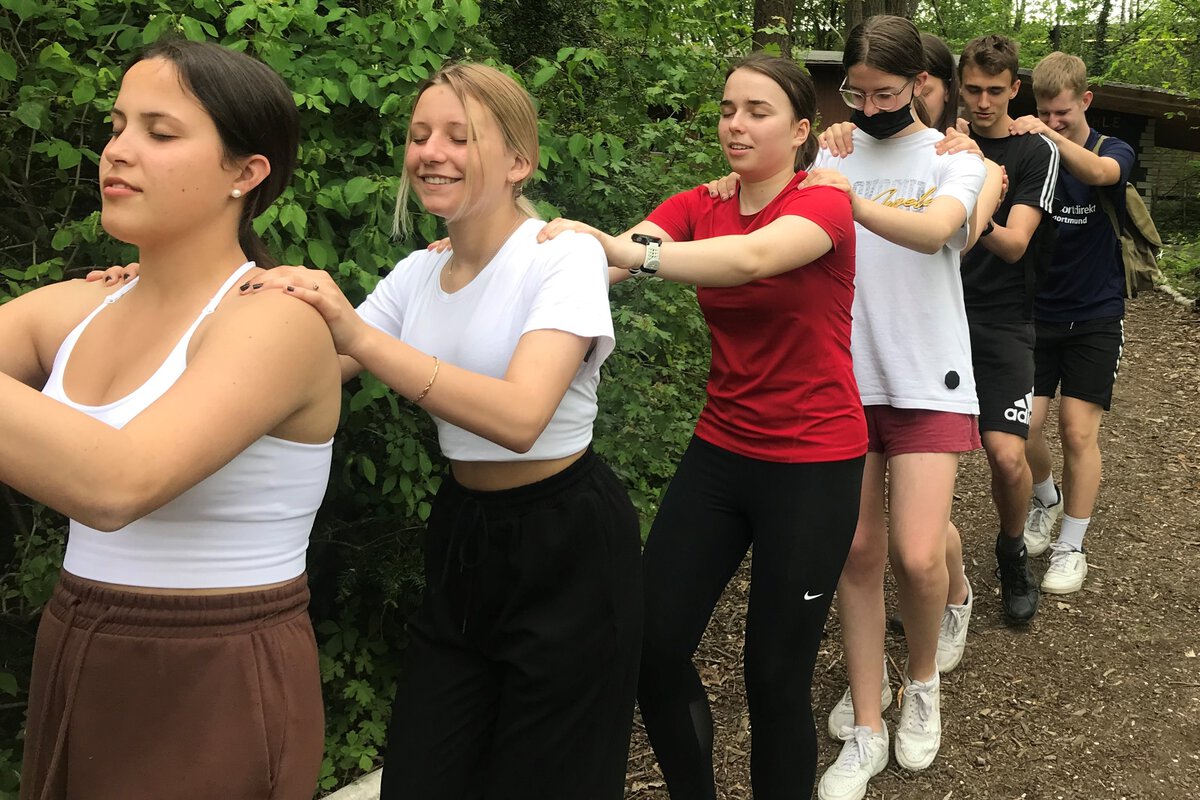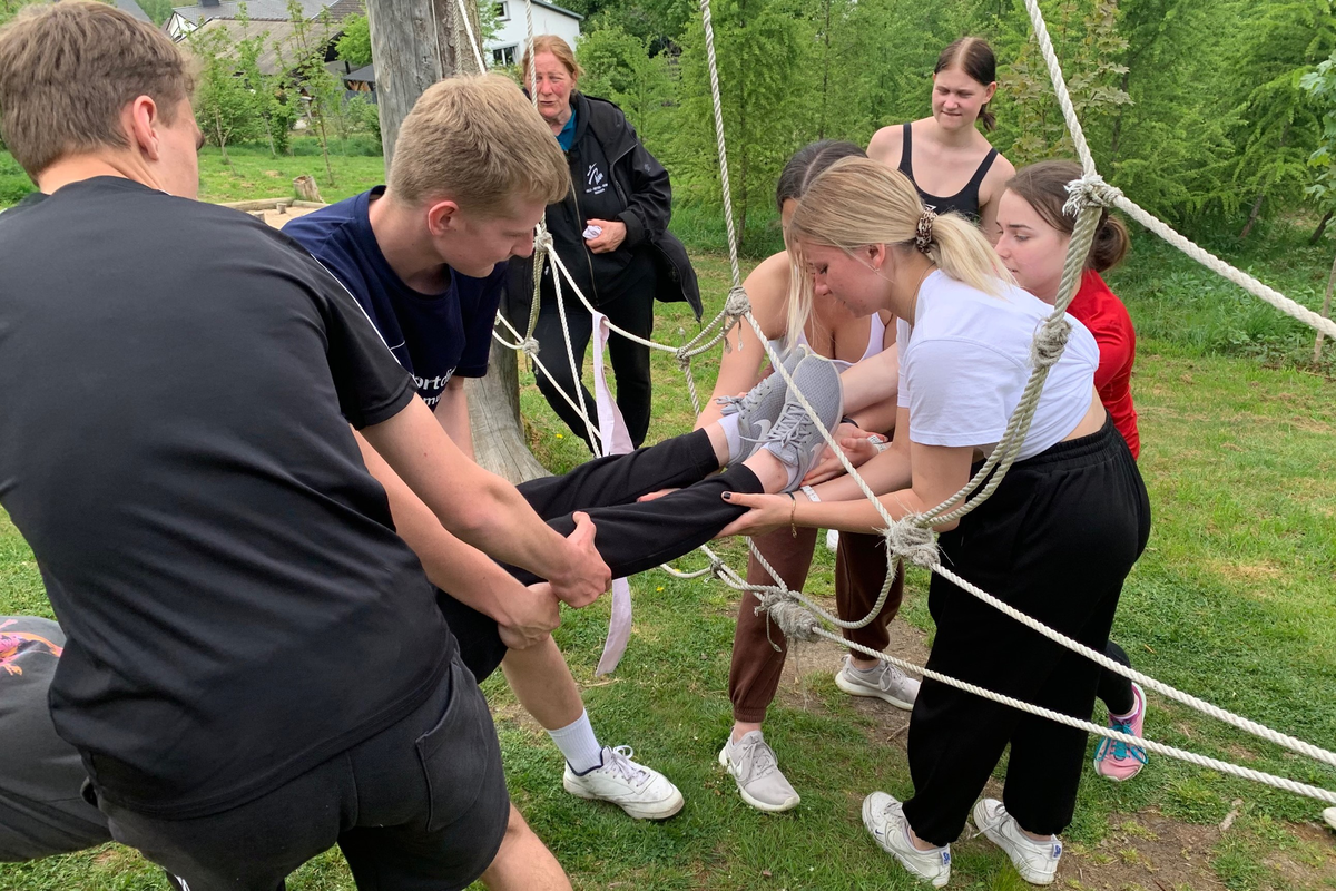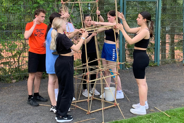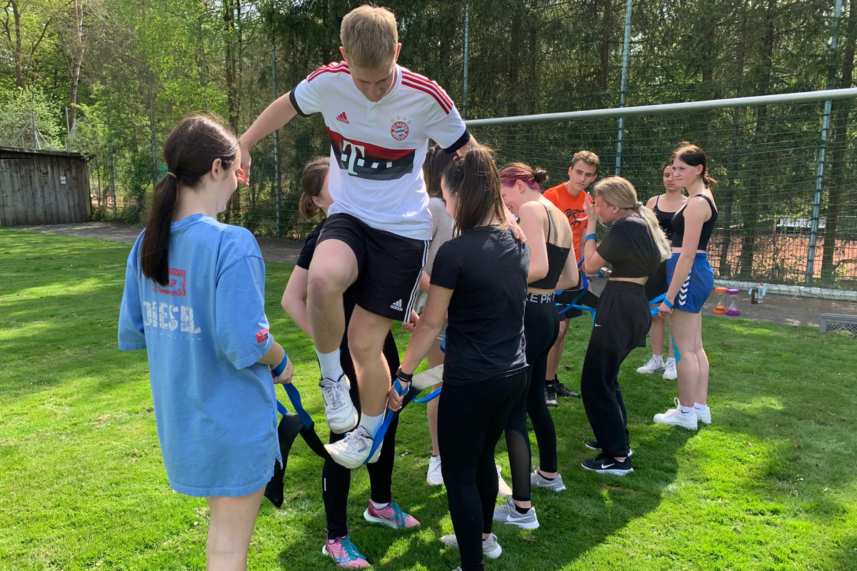 Bei der Sporthelferfahrt, die vom 09.05.-11.05.22 unter der Leitung von Frau Danker und Frau Bick stattfand, probierten wir, um den Teamgeist zu verbessern, verschiedene Spiele und Sportarten aus. Teambildende Spiele wie Flag-Football, Kin-Ball oder Teamparcours standen auf dem Programm. Als kooperative Spiele testeten wir Slackline, Staffellauf-Biathlon sowie einen Turmbau aus Bambusstöcken und Gummibändern.
