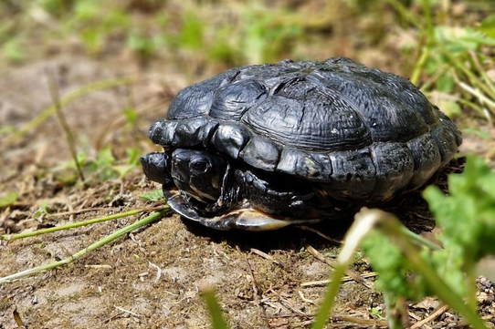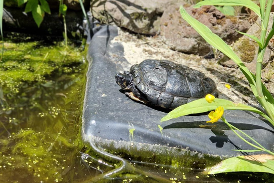 Unser langjähriger Mitbewohner, die Gelbwangen-Schmuckschildkröte Snappy, hat in den Sommerferien für die Sommermonate ihr Außenquartier bezogen. Als wechselwarmes Tier nimmt er, so oft er kann, ein Sonnenbad, um seinen Körper auf Temperatur zu bringen.