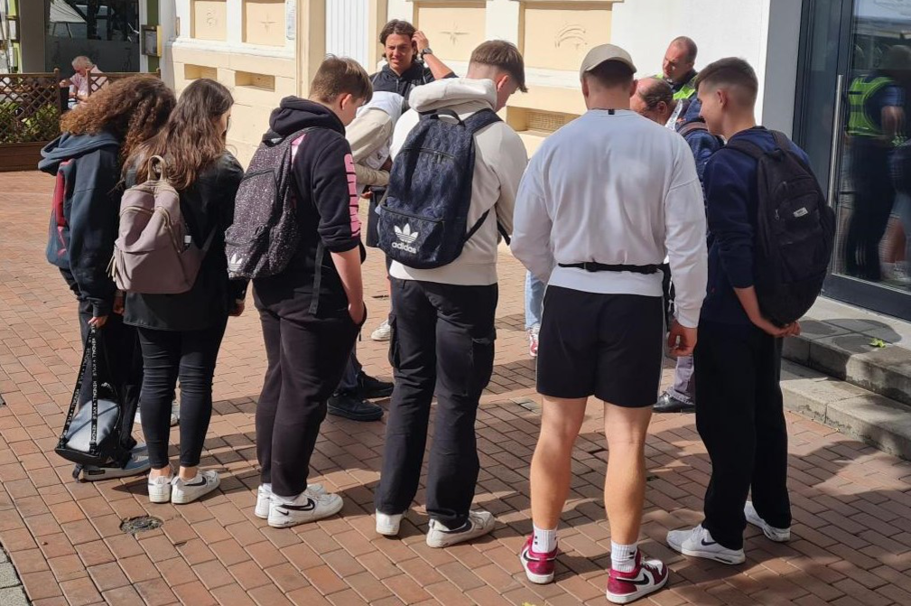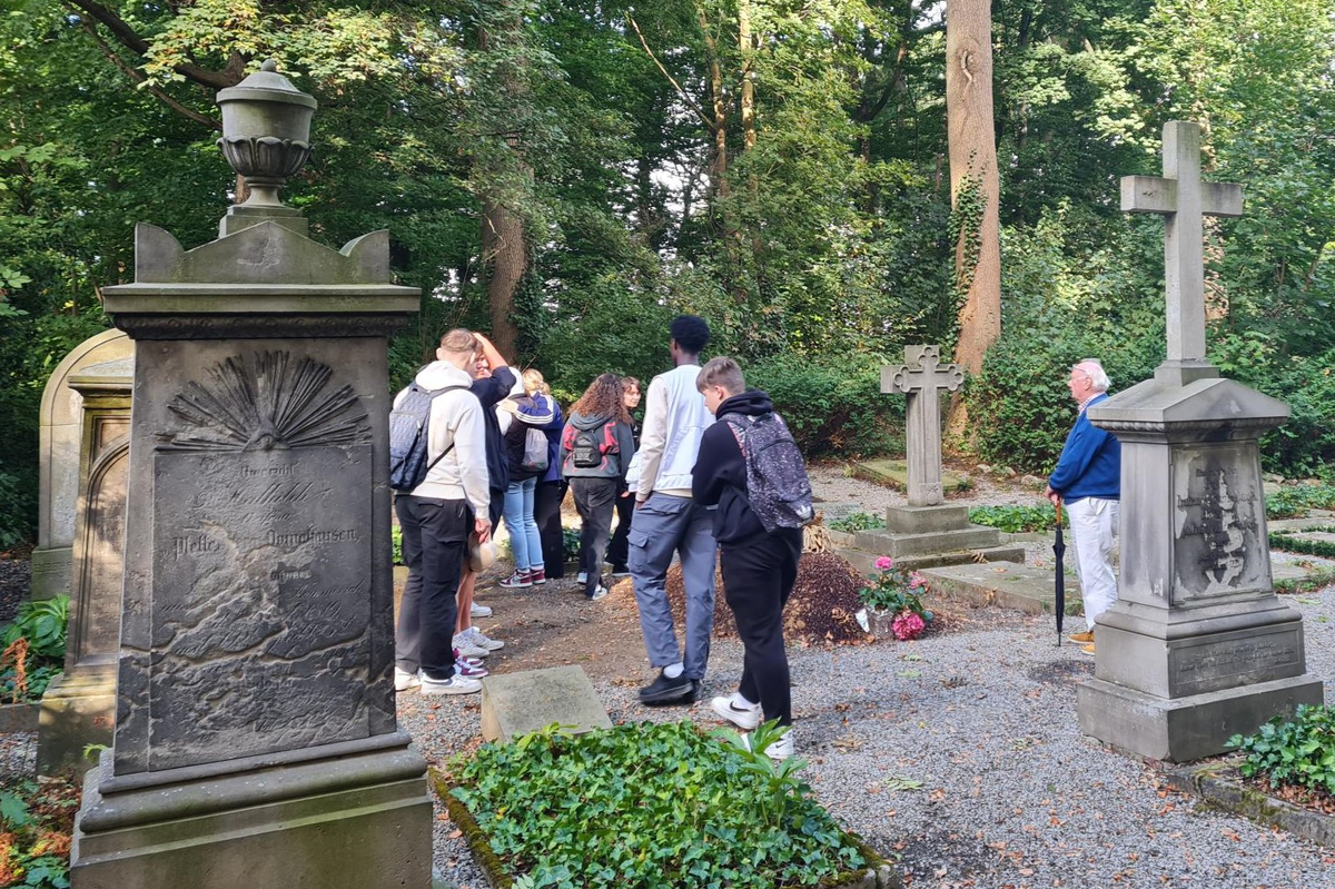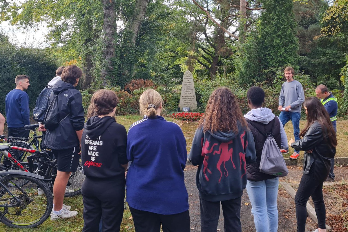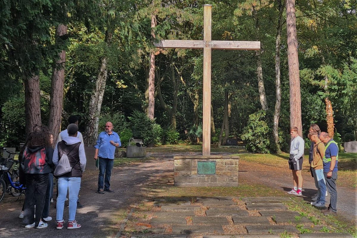 Zum Abschluss der Woche stand bei allerschönstem Wetter die traditionsreiche geschichtlich orientierte Radtour rund ums Kamener Kreuz auf dem Plan („History Cycling“). An den Stolpersteinen auf dem Markt, dem jüdischen Friedhof in Kamen, dem Grab des Grafen Schwerin von Krosigk (dem Reichminister für Finanzen von 1932 – 1945) in Heeren sowie dem Obelisken für osteuropäische Zwangsarbeiter auf dem Heerener Friedhof wurden verschiedenen Aspekte der NS-Diktatur beleuchtet.