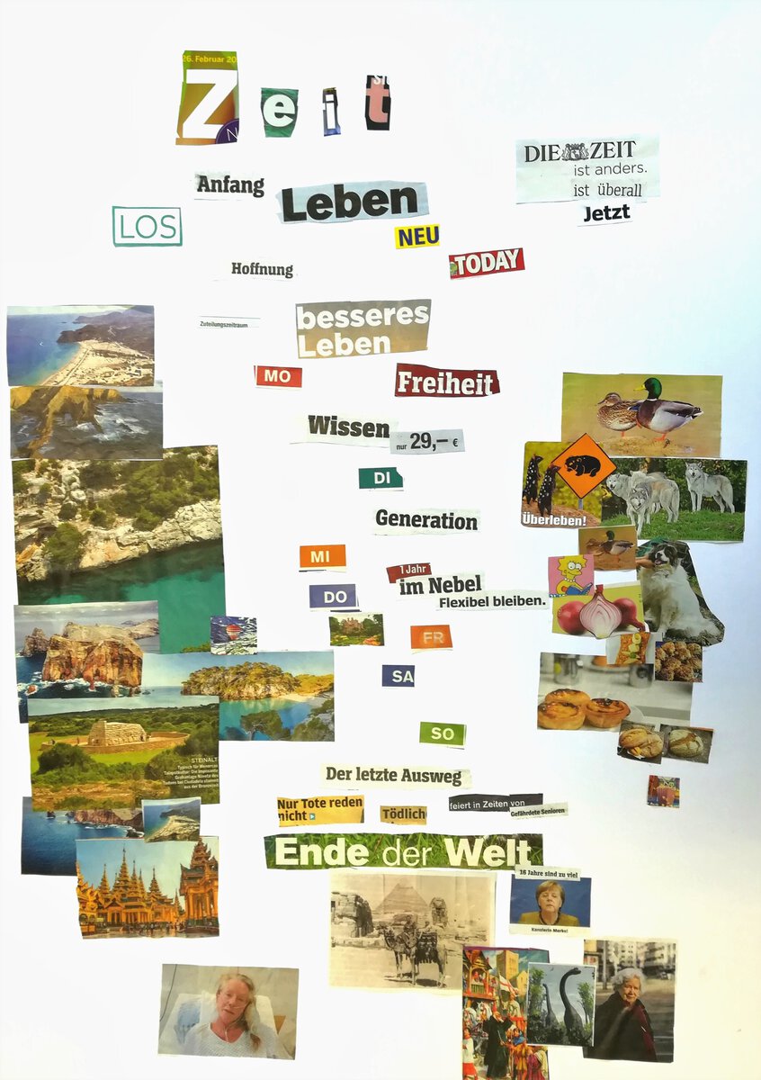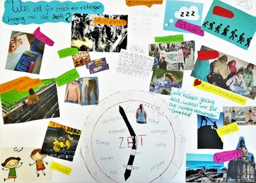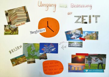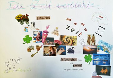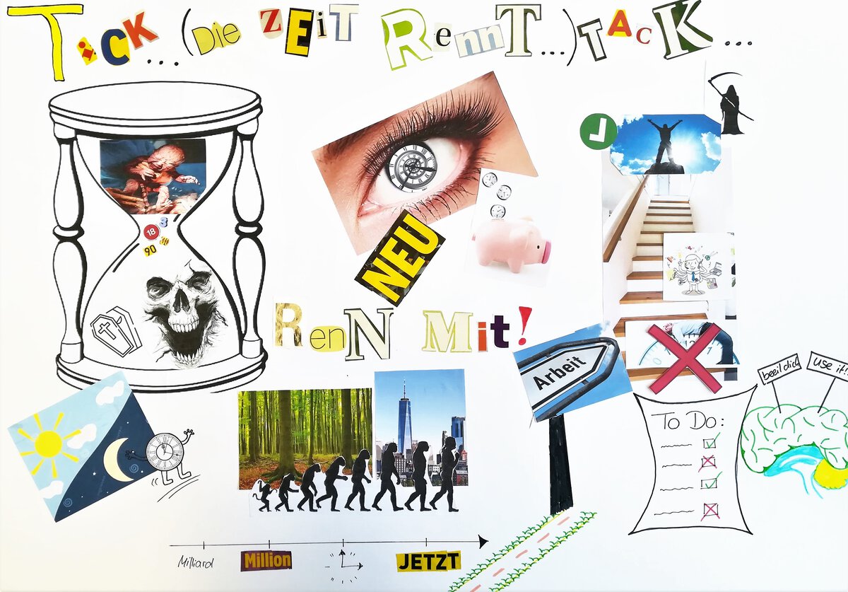 Was ist Zeit? Was bedeutet sie mir? Wie nutze ich meine Zeit sinnvoll? – Zu diesen wichtigen Fragen fertigten die Schüler:innen des Lateinkurses der Q2 Collagen an, die auf sehr persönliche Weise die Bedeutung und den Umgang der Schüler:innen mit „ihrer“ Zeit dokumentieren.