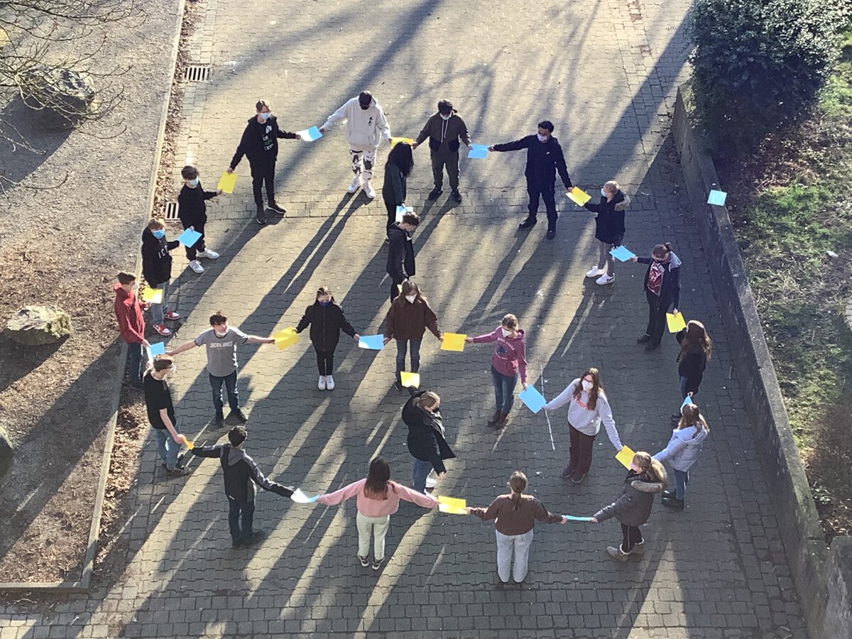 Angesichts des Krieges in der Ukraine haben die Schüler*innen unserer Gesamtschule in den letzten Wochen ein Zeichen für den Frieden gesetzt - im Kleinen auf unserem Schulgelände und im Großen bei der Kundgebung auf dem Marktplatz in Kamen (4. März).