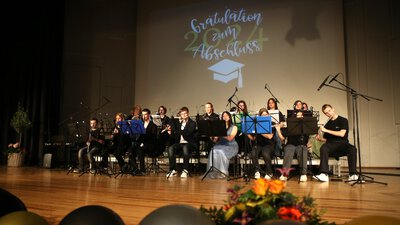 Natürlich ließen wir unsere 10er*innen nicht nur mit warmen Worten ziehen. Caitlyn (Gesang) und Laura (Keyboard) beegeiterten mit einem gefühlvollen Gesangsauftritt, an dessen Schluss die Konzertaula nicht nur von einem Meer aus Handylichtern illuminiert wurde, sondern auch rote Herzen von der Decke auf die Bühne fielen. Für die weitere musikalische Abrundung der stimmungsvollen Feier sorgten die Musikklasse 7f und die Bigband unter der Leitung von Frau Hüls und Herrn Versümer.