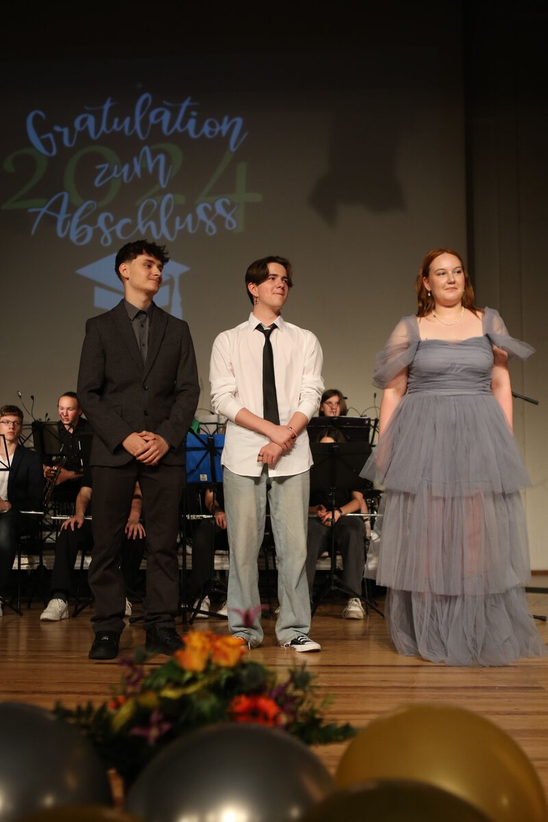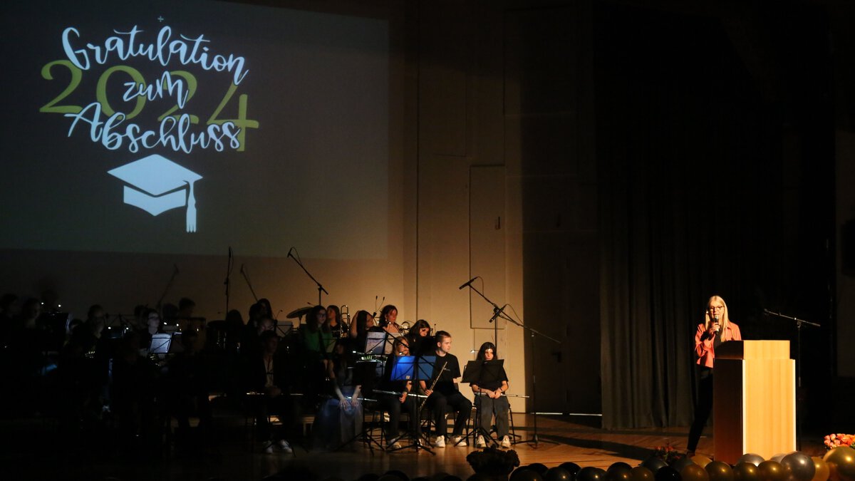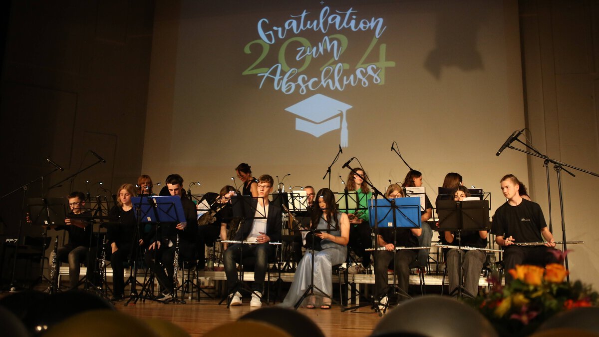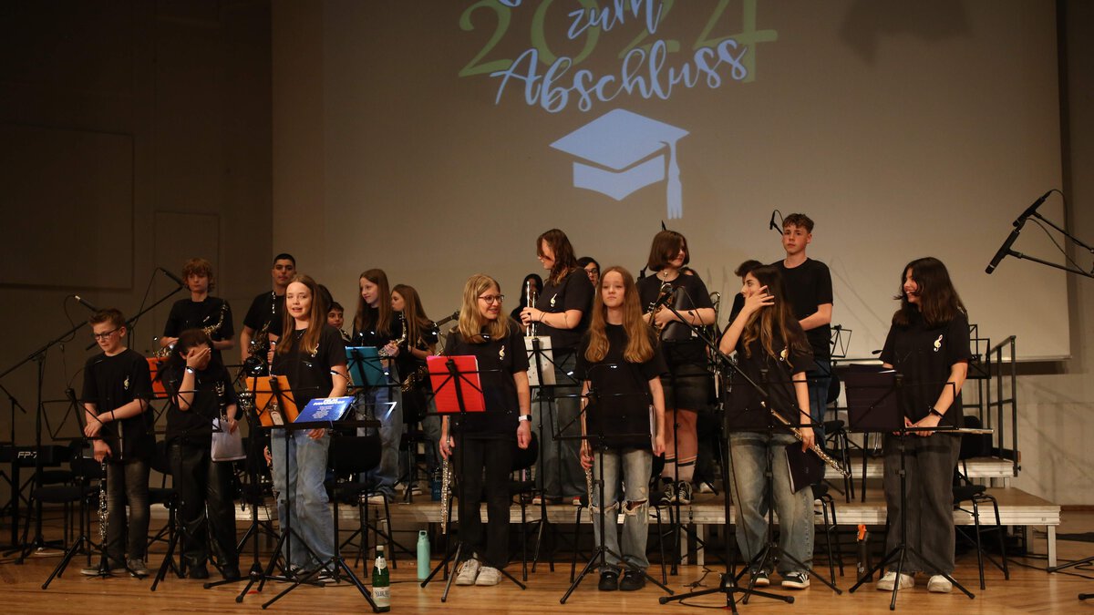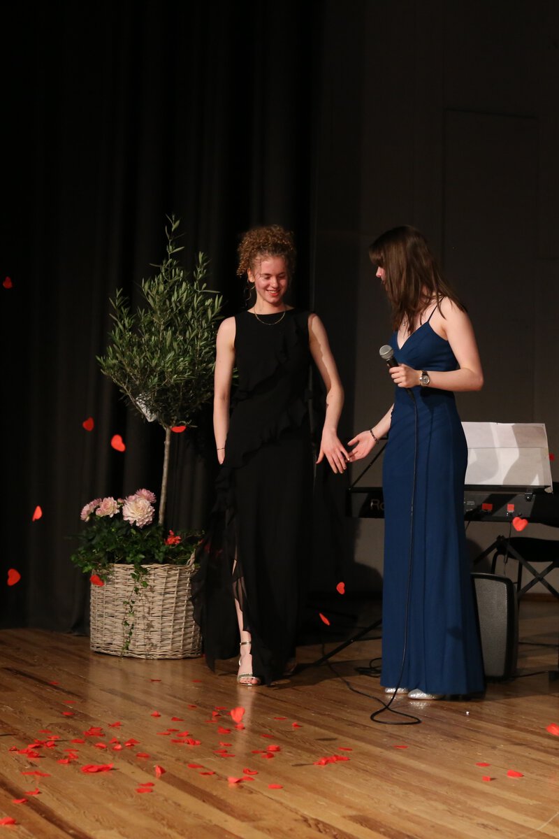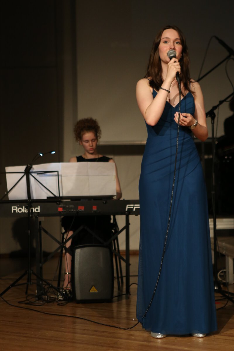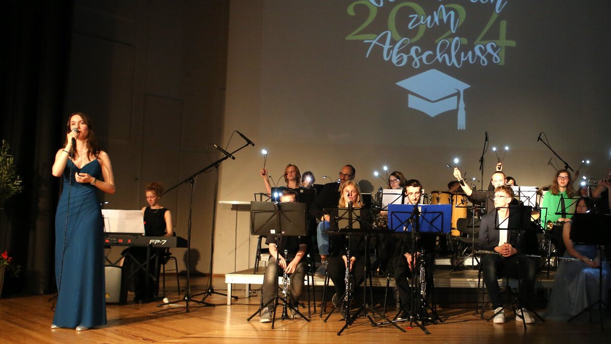 Natürlich ließen wir unsere 10er*innen nicht nur mit warmen Worten ziehen. Caitlyn (Gesang) und Laura (Keyboard) beegeiterten mit einem gefühlvollen Gesangsauftritt, an dessen Schluss die Konzertaula nicht nur von einem Meer aus Handylichtern illuminiert wurde, sondern auch rote Herzen von der Decke auf die Bühne fielen. Für die weitere musikalische Abrundung der stimmungsvollen Feier sorgten die Musikklasse 7f und die Bigband unter der Leitung von Frau Hüls und Herrn Versümer.