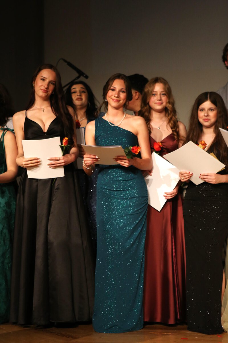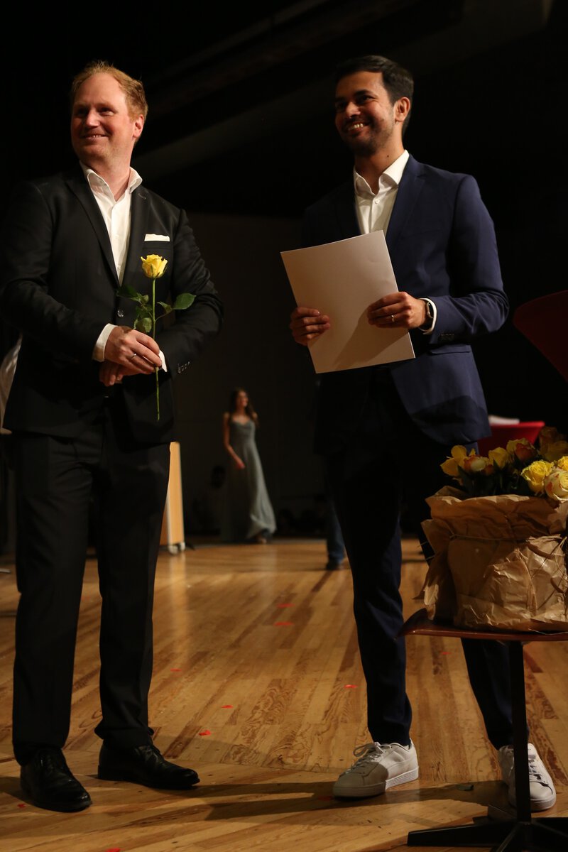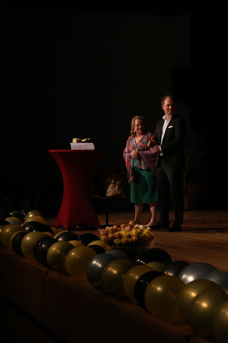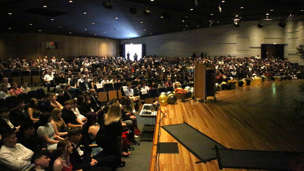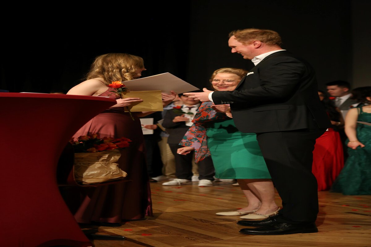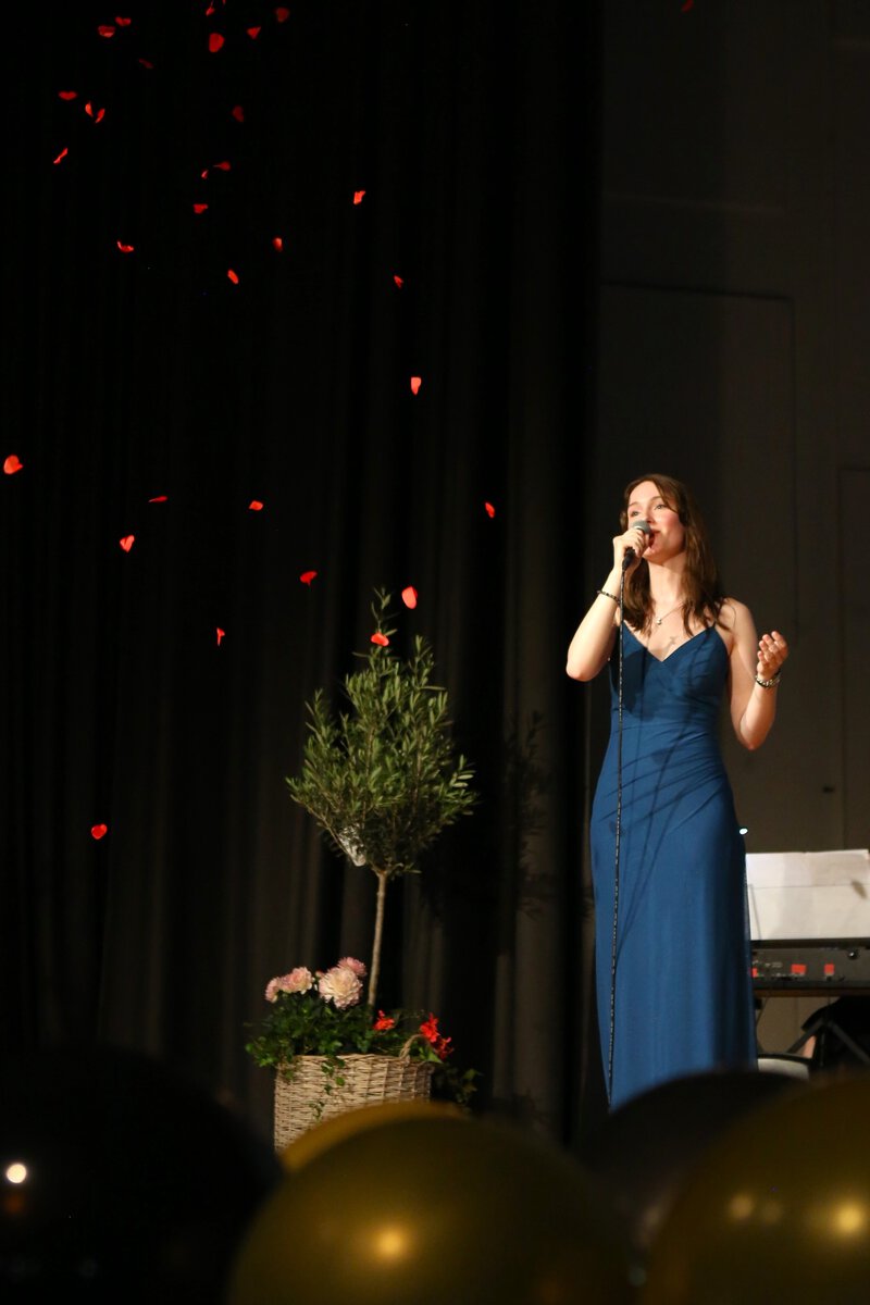 Natürlich ließen wir unsere 10er*innen nicht nur mit warmen Worten ziehen. Caitlyn (Gesang) und Laura (Keyboard) beegeiterten mit einem gefühlvollen Gesangsauftritt, an dessen Schluss die Konzertaula nicht nur von einem Meer aus Handylichtern illuminiert wurde, sondern auch rote Herzen von der Decke auf die Bühne fielen. Für die weitere musikalische Abrundung der stimmungsvollen Feier sorgten die Musikklasse 7f und die Bigband unter der Leitung von Frau Hüls und Herrn Versümer.