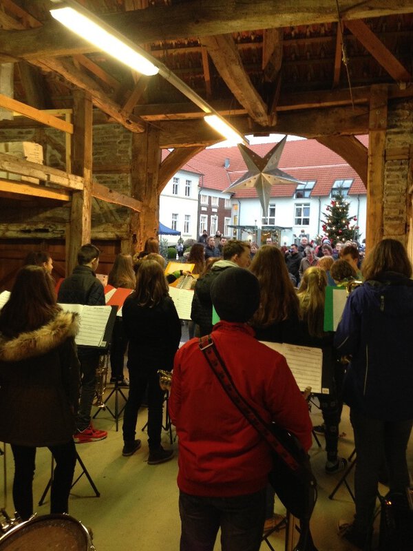 Diesmal war es ein besonders stimmungsvoller Auftritt, da das Orchester wegen des Sturmes und des Regens nicht im Freien spielen konnte, sondern in den Stall ausweichen musste. Bei weit geöffneten Türen erklangen traditionelle und swingende Weihnachtsmelodien im Innenhof von Haus Volkermann, die bis in die Zimmer zu hören waren. So konnten nicht nur die Zuhörer, die vor dem Stalltor standen, das Konzert hören, sondern auch die Bewohner, die das Haus nicht verlassen konnten.