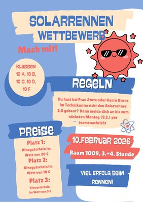 Im vergangenen Halbjahr haben sich die 10. Klassen im Fachbereich Technik im Unterricht bei Frau Stute und Herrn Bruns mit dem Thema „Verkehrstechnik“ befasst und unter anderem neben theoretischen Inhalten wie verschiedenen Antriebs- und Sicherheitssystemen auch praktisch gearbeitet. Entstanden sind vielfältige Solarrenner, die am vergangenen Dienstag in zwei Kategorien beim 1. Solarrennen gegeneinander antreten konnten. So wurde einmal die Schnelligkeit unter Beweis gestellt und im zweiten Wettbewerb das Aussehen und die Ausgestaltung der Solarrenner.