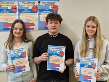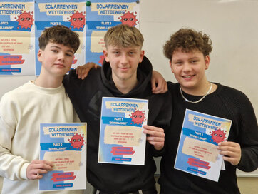 Nach einem spannenden Wettstreit gewann den 1. Preis mit dem schnellsten Solarauto Veit aus der 10 C, knapp gefolgt mit nur 0,04 Sekunden Abstand auf Platz 2 von Elias, ebenfalls Klasse 10 C. Auf Platz 3 landete Tyler aus der 10 D. Alle drei konnten sich über einen Gutschein für das Kinorama in Unna freuen.
