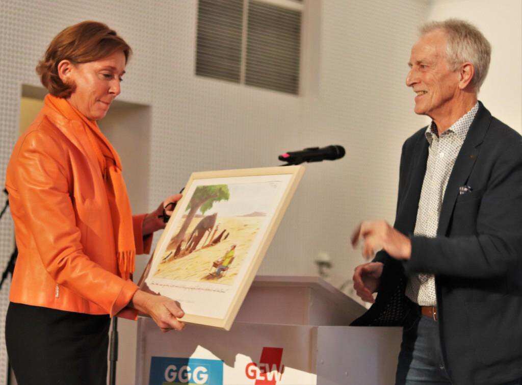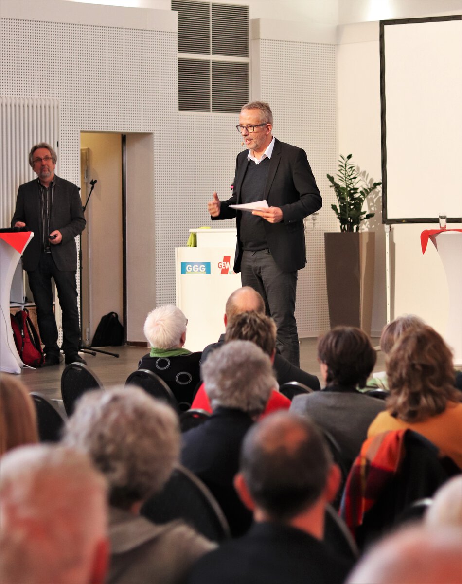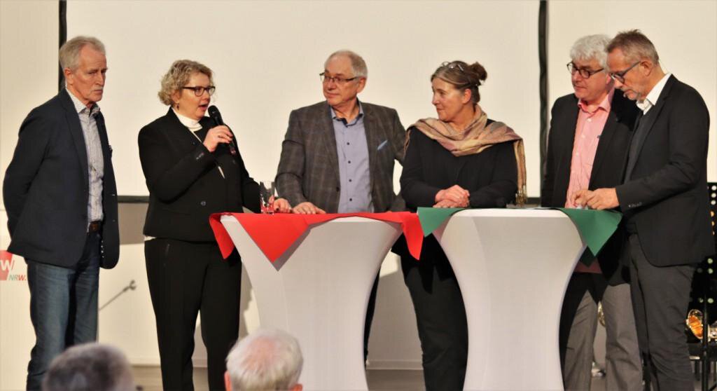 Am Dienstag (19. November) machte sich eine rund fünfundzwanzigköpfige Delegation unserer Schule, bestehend aus Schüler*innen, Eltern und Lehrkräften auf den Weg zur Eventkirche Dortmund, um den fünfzigsten Gründungstag der Gesamtschule in NRW zu feiern. Eingeladen hatten die Gewerkschaft Erziehung und Wissenschaft (GEW) und die Gemeinnützige Gesellschaft Gesamtschule (GGG). Nach einem musikalischen Empfang eröffnete WDR-Moderator Helmut Rehmsen die „Geburtstagsfeier“. Zunächst gab es einen kurzen Filmbeitrag zu Einrichtung der ersten Gesamtschulen aus dem Jahr 1969, anschließend wurden die sieben Gründer-Gesamtschulen – darunter auch unsere Gesamtschule – in filmischen Portraits vorgestellt. In den anschließenden verschiedenen Redebeiträgen wurde u. a. das fehlende „Abschulen“ (im Gegensatz zu den Schulformen des dreigliedrigen Schulsystem) gewürdigt, der wichtige Beitrag im Rahmen von Inklusion und Integration sowie die engagierte Unterstützung der Schüler*innen durch die Lehrkräfte Sie trügen im Wesentlichen dazu bei, Chancengleichheit im Bildungsbereich zu ermöglichen: Nur so sei zu erklären, dass viele Kinder aus bildungsfernen Elternhäusern zum Abitur gelangten, obwohl rund 70% der Abiturient*innen an Gesamtschulen nach der 4. Klasse keine Gymnasialempfehlung hatten. Mit eher verhaltenem Applaus wurde die Rede der Ministerin für Schule und Bildung, Frau Yvonne Gebauer (FDP), aufgenommen, die ihrerseits den Gesamtschulen zum 50. Geburtstag gratulierte und z. B. die Maßnahmen des Ministeriums zur besseren personellen Ausstattung von Schulen des gemeinsamen Lernens im Allgemeinen und zur Förderung von Inklusion und Integration herausstellte. Aufgelockert wurde die Feier-Veranstaltung durch eine Maskentheater-Darbietung. Nach einer Talk-Runde endete die Feier mit einem kleinen Imbiss. (Fotos: Arnd Joeres; Text: Dario Groer (Q1) und Arnd Joeres)