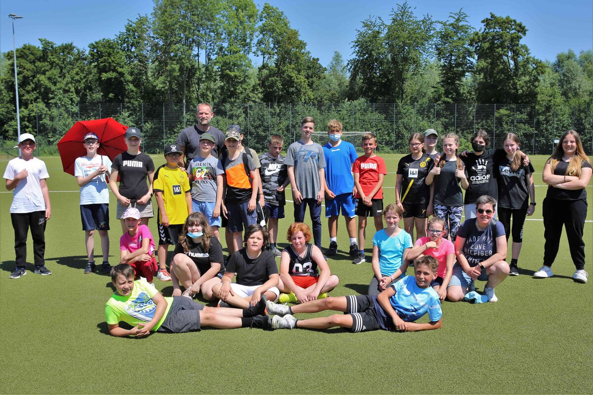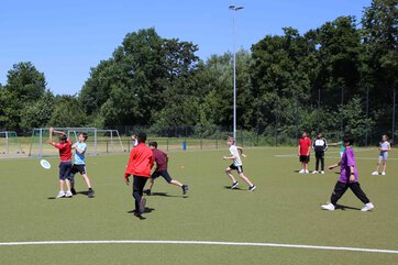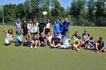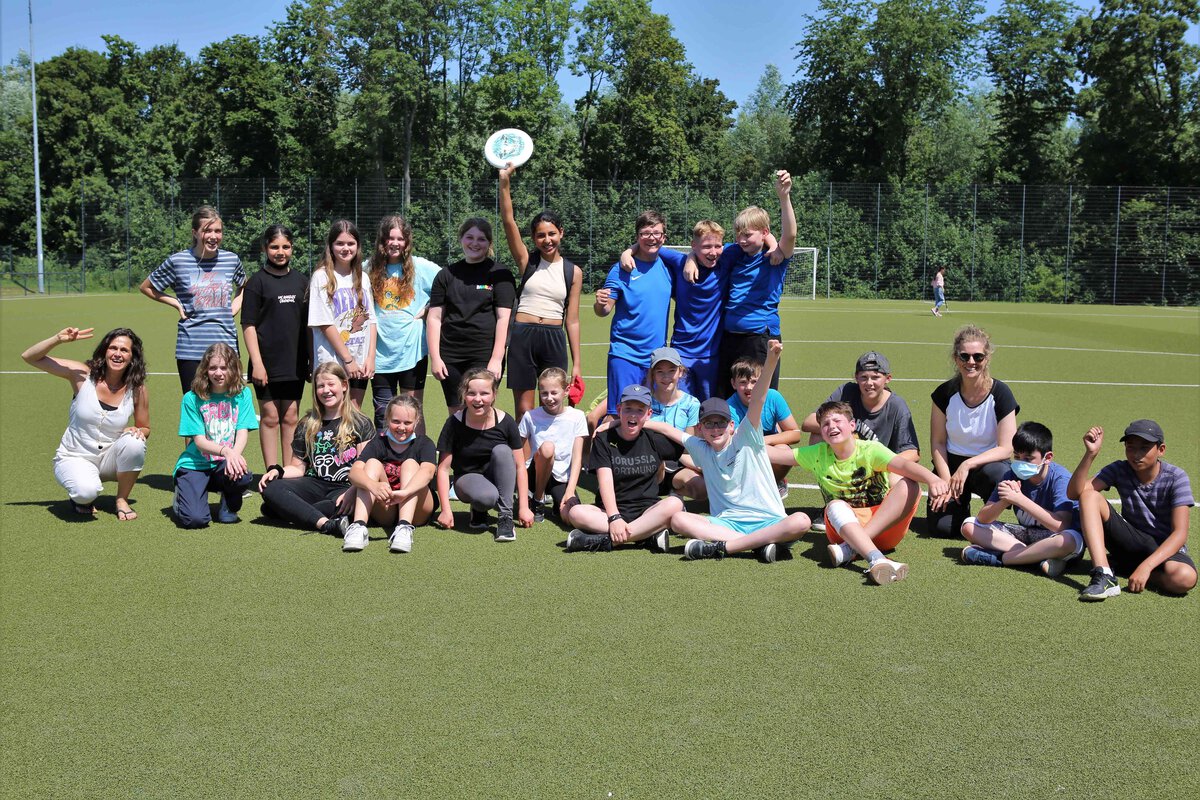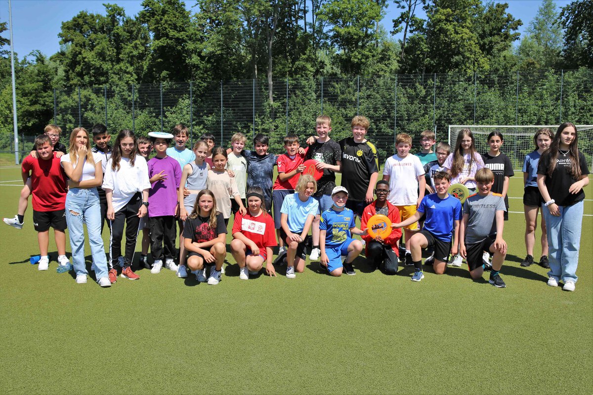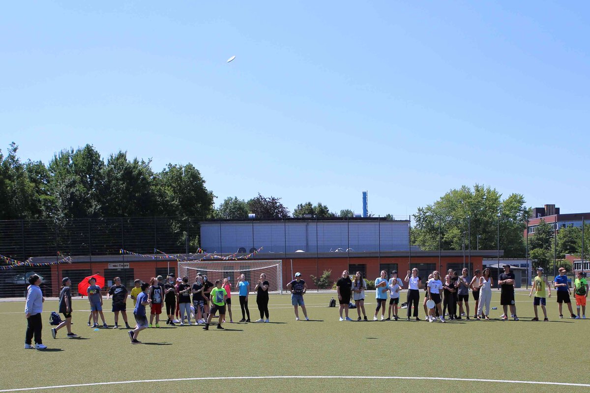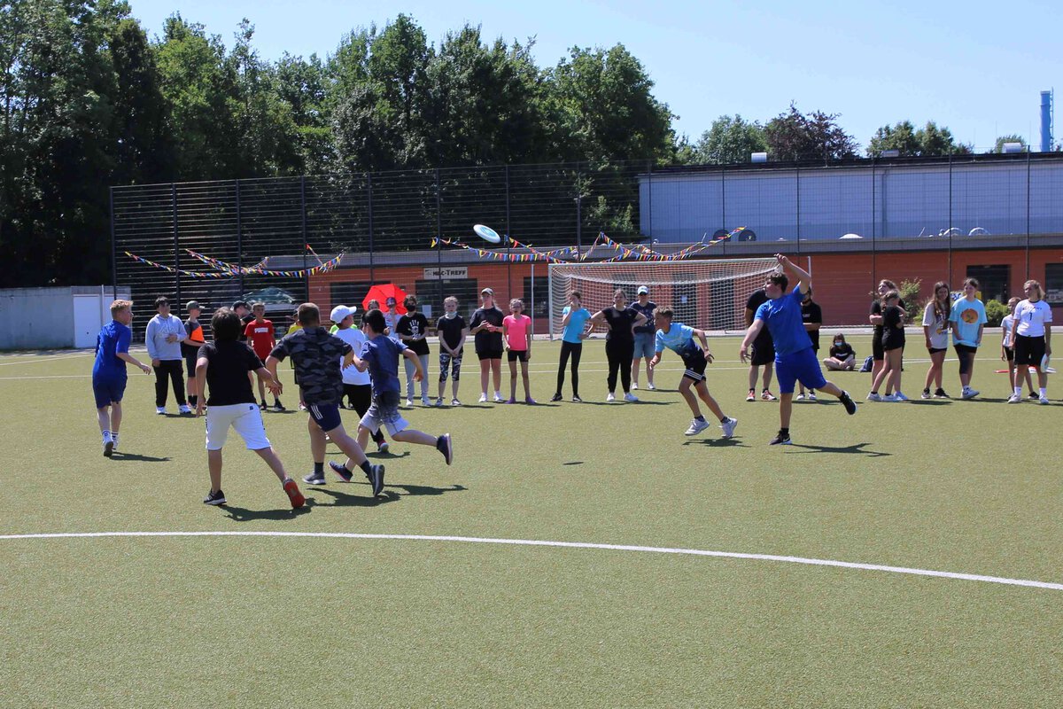 Die Sechstklässler traten trotz sommerlicher Temperaturen mit Sonnencreme, Kopfbedeckung und genug Getränken ausgestattet beim Frisbeespiel gegeneinander an.