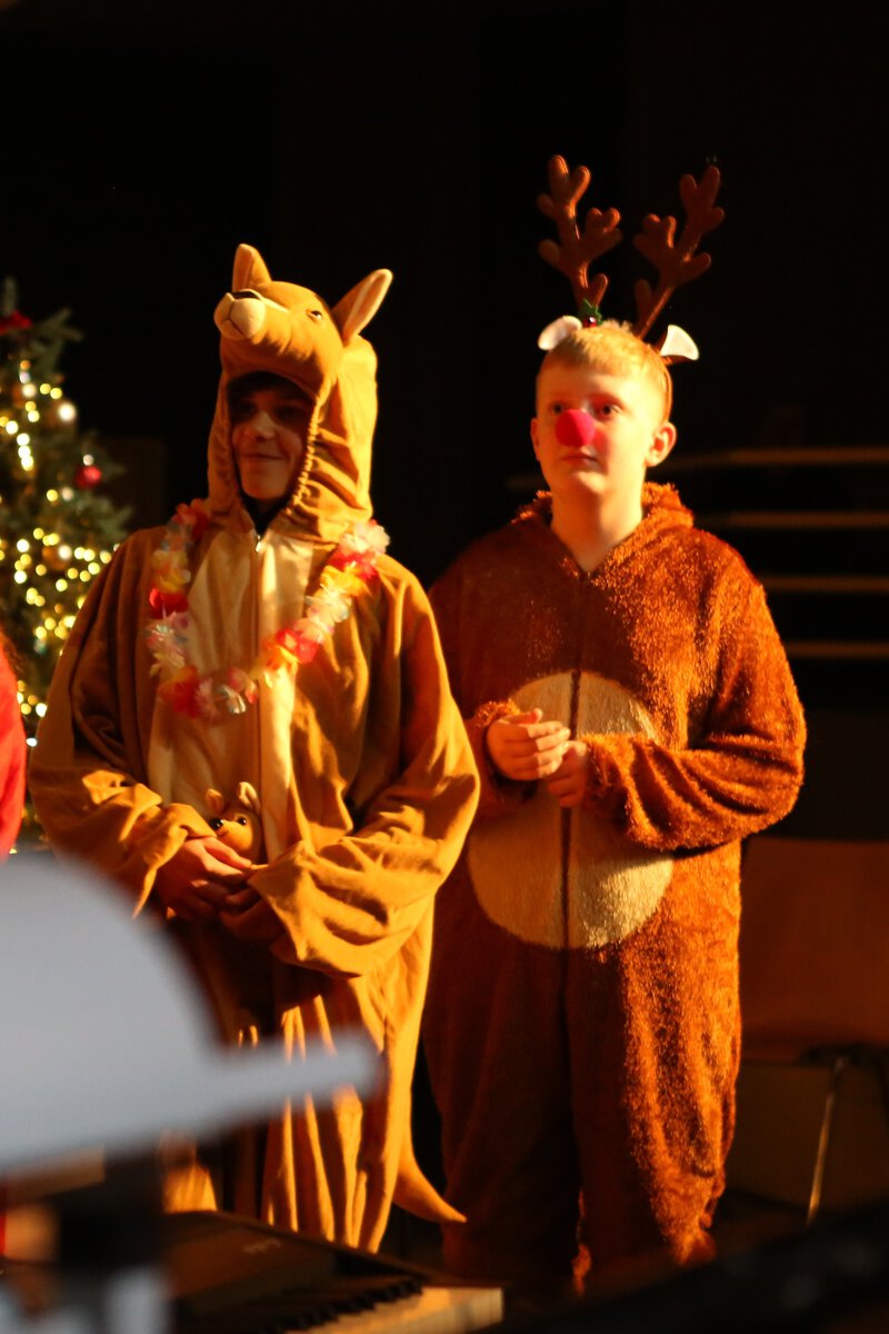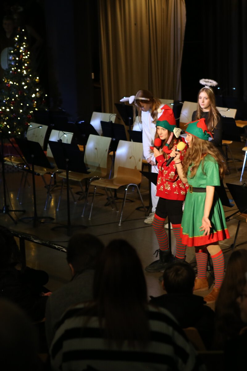 Im Anschluss moderierten Schüler*innen der 8f bei ihrem letzten Weihnachtskonzert das eigentliche Konzert an. Unsere Musikklassen 5f, 6f und 7f weihnachtliche spielten alte und moderne Klassiker in neuen Arrangements und auch der Unterstufen-Chor „Hard Chor Voices“ trat unter großem Applaus in der voll besetzten Studiobühne unserer Gesamtschule auf. Auch das Publikum wurde von der 8f aktiv einbezogen: Die Zuschauer*innen mussten pantomimisch präsentierte Weihnachtslieder erraten.